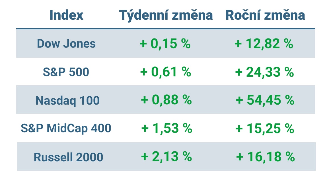 Tabulka ukazuje vývoj nejvýznamnějších amerických indexů v tomto týdnu a v roce 2023