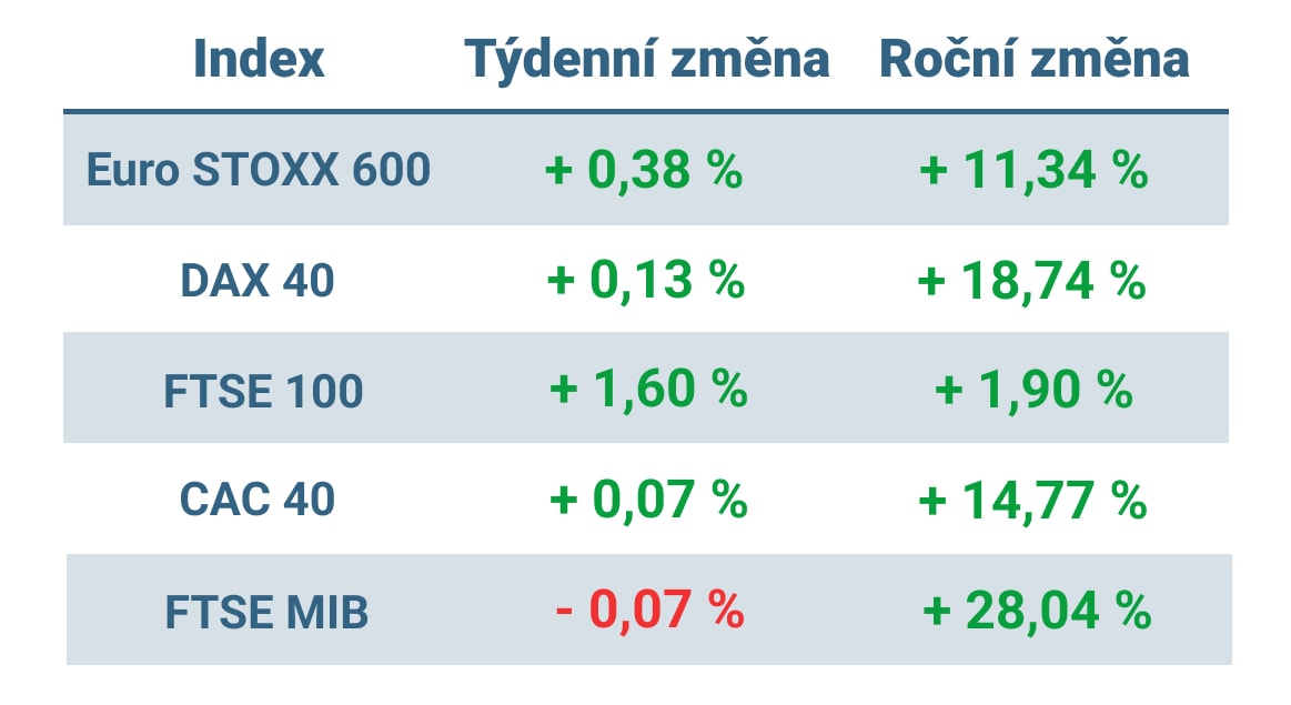 Tabulka ukazuje vývoj nejvýznamnějších evropských indexů v tomto týdnu a roce 2023