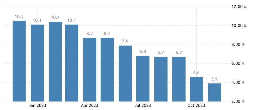 Inflace ve Spojeném království se za dvanáct měsíců do listopadu zpomalila více, než se očekávalo, na 3,9 % z říjnové roční míry 4,6 %, a to v důsledku poklesu cen motorových paliv, rekreace, kultury a potravin. Základní cenové tlaky měřené jádrovou inflací rovněž zmírnily a dosáhly 5,1 %.