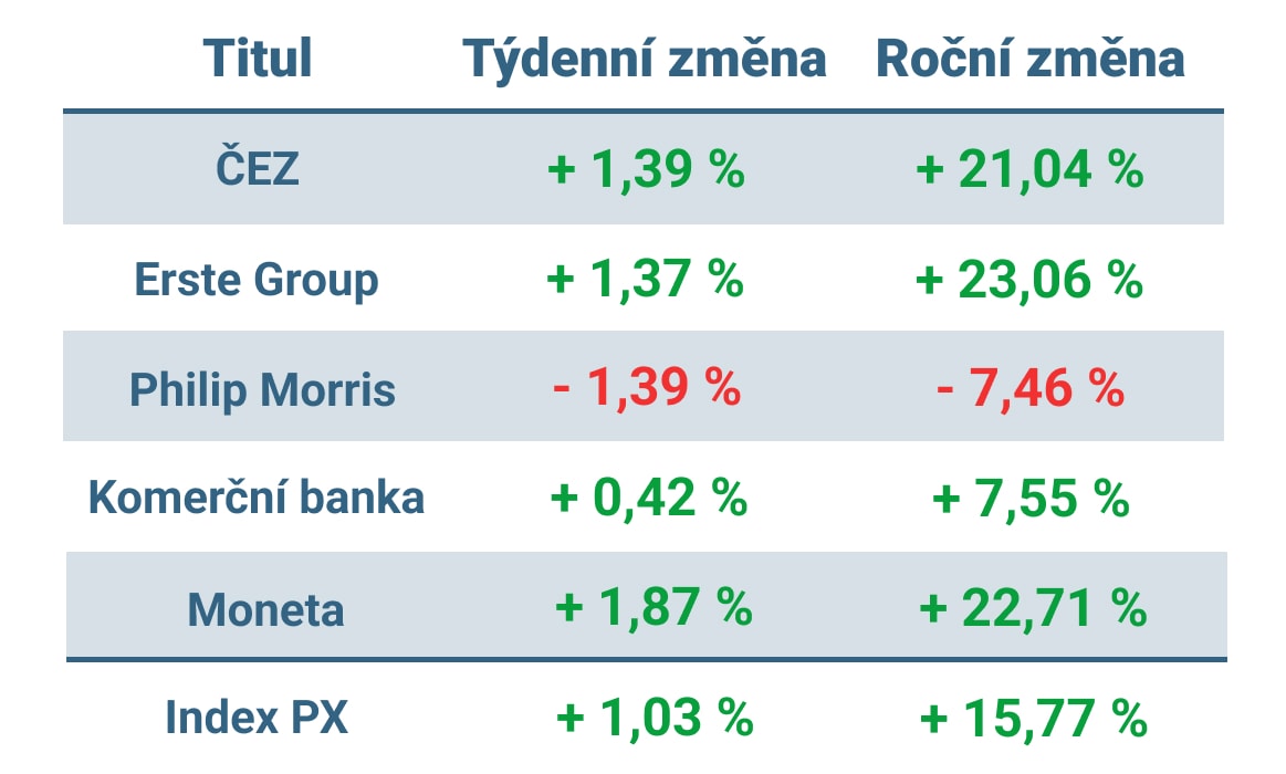 Vývoj ceny nejvýznamnějších titulů obchodovaných na pražské burze v tomto týdnu a od začátku roku 2023