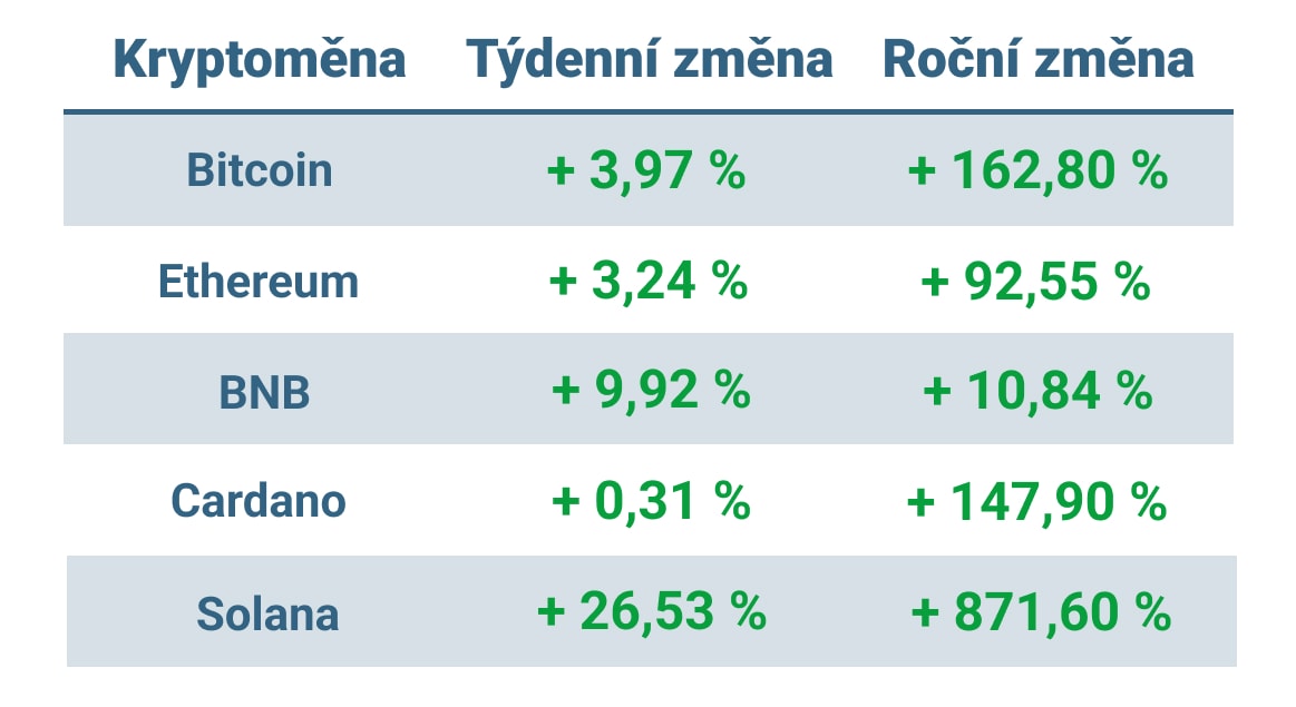 Největší kryptoměny v posledním týdnu opět rostly. K sobotní 9. hodině ranní Bitcoin posílil za posledních 7 dní o necelá 4 %, zatímco Ethereum o 3 %. V týdnu se výrazně dařilo BNB, které si připsalo téměř 10 %.