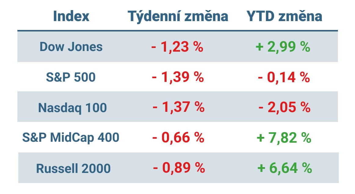 Tabulka ukazuje vývoj nejvýznamnějších amerických indexů v uplynulém týdnu a od začátku roku