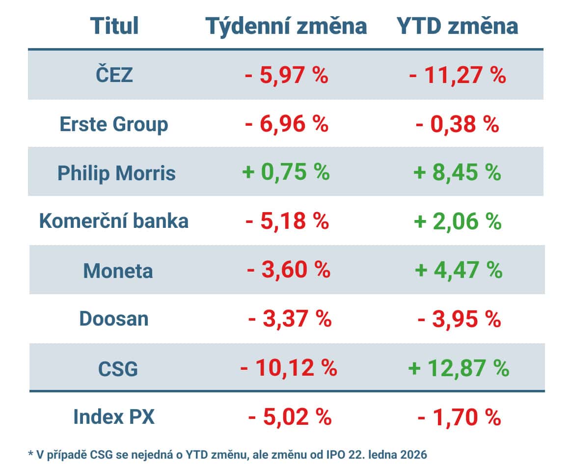 Pražská burza tento týden tvrdě narazila – index PX spadl o 5,02 % a od začátku roku je níž o 1,70 %. Ztrácely v podstatě všechny významné tituly, což se v závěru týdne projevilo pádem indexu na letošní minima.