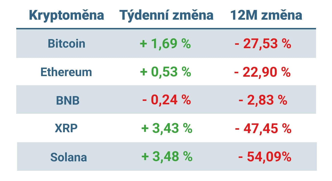 Vývoj ceny nejvýznamnějších kryptoměn v uplynulém týdnu a za posledních 12 měsíců