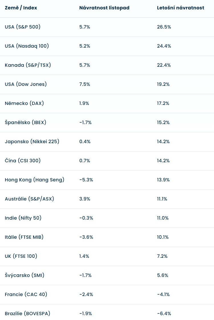 Listopad přinesl překvapivé výsledky na světových akciových trzích. Americké trhy dominovaly, zatímco Evropa a Asie vykázaly ztráty. Zjistěte, které indexy byly nejziskovější a kde hledat investiční příležitosti.