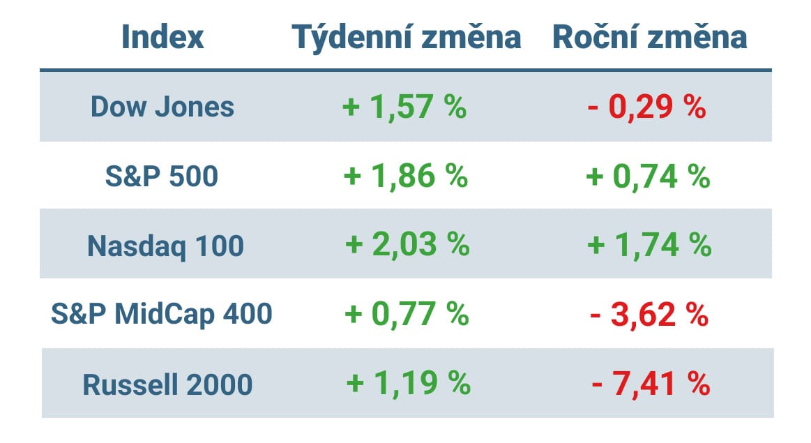 Tabulka ukazuje vývoj nejvýznamnějších amerických indexů v tomto týdnu a v roce 2025
