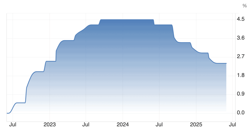 Vývoj výše základní úrokové sazby ECB za poslední 3 roky