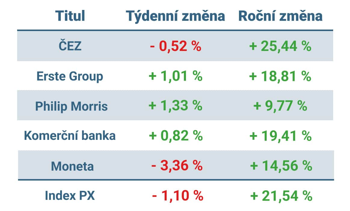 Pražská burza za sebou má druhý týden, během něhož mírně oslabila. Index PX zakončil týdenní obchodování na hodnotě 2 149 bodů, což představuje týdenní ztrátu 1,10 %.
