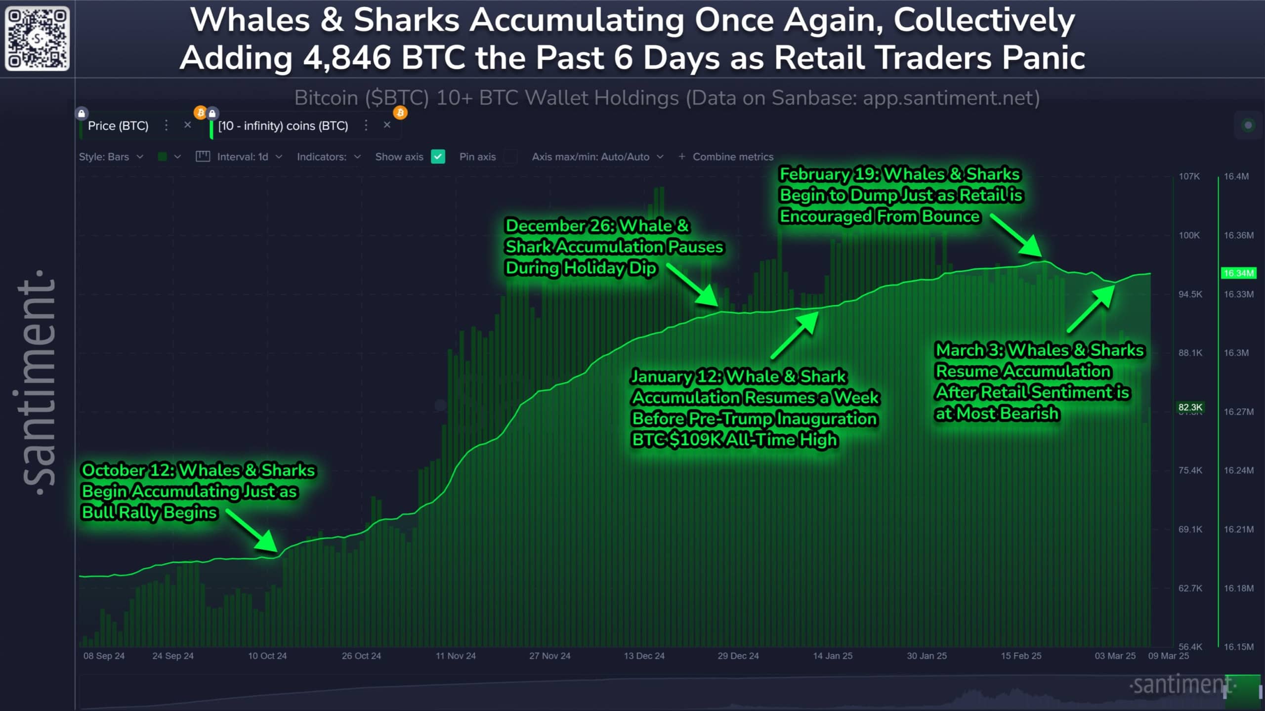 Analytická platforma Sanitment poznamenala, že peněženky, které drží 10 a více BTC, zahájily fázi silné akumulace kolem 12. října. To bylo těsně před tím, než Bitcoin zaznamenal obrovský růst.