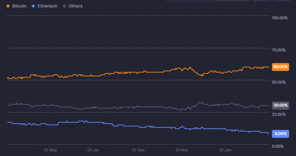 Vývoj dominance Bitcoinu a Etherea