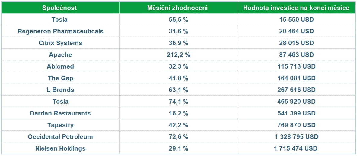 Akcie, které zaznamenaly nejvýraznější růst v jednotlivých měsících. Zdroj: S&P Global Market Intelligence