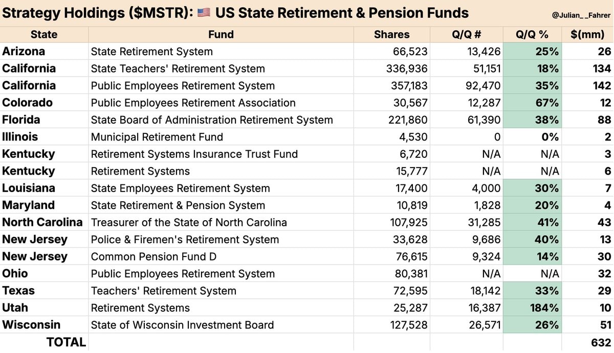 Veřejné penzijní fondy již investují do Bitcoinu, ačkoliv nepřímo. V květnu drželo 14 amerických států ve svých penzijních fondech akcie Strategy v hodnotě 632 milionů dolarů.