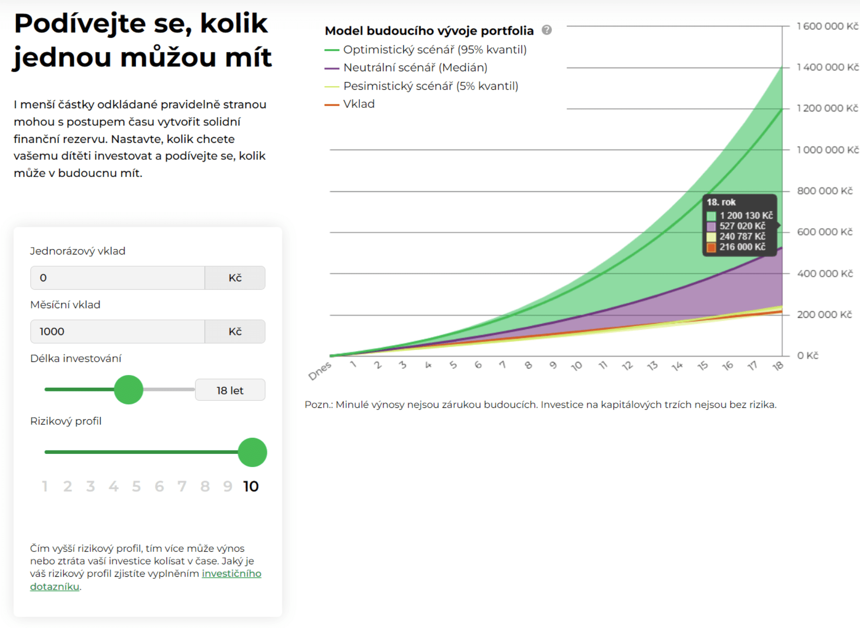 Potenciální výsledky: Při 18letém investičním horizontu a měsíčním vkladu 1 000 korun by mohly vaše disponovat v 18 letech v optimistickém scénáři více než milionem korun, při investované částce 216 000 korun.