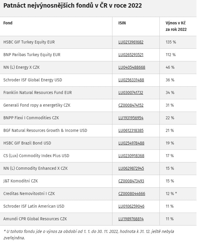 Patnáct nejvýnosnějších fondů v ČR v roce 2022