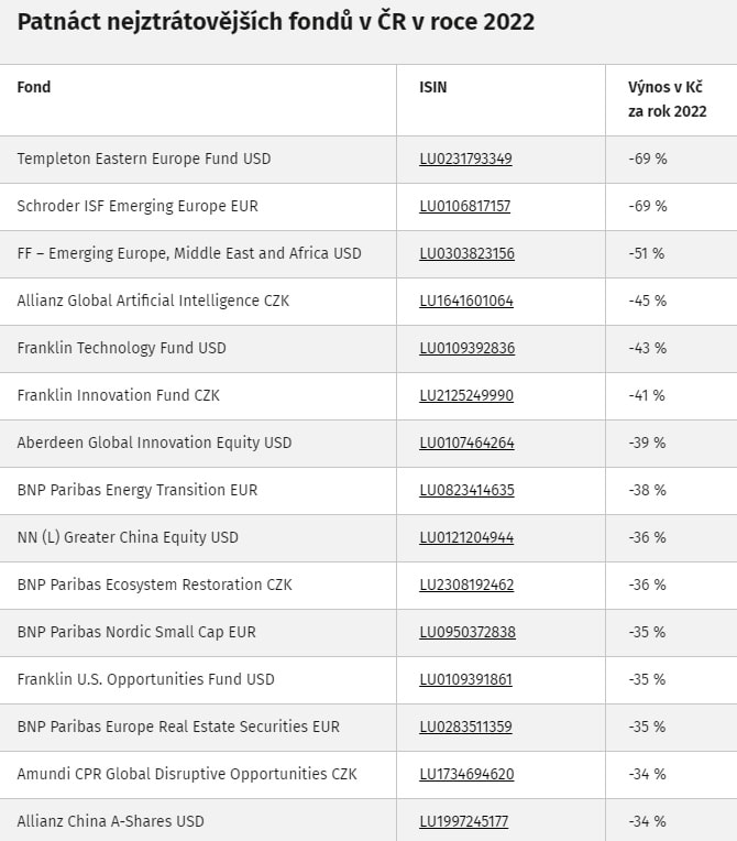 K tomuto číslu přispěl také akciový pokles největších technologických společností, přičemž akciový index Nasdaq, klesl v loňském roce o 33 %. V tabulce níže jsou uvedeny nejztrátovější podílové fondy, nabízené v ČR.