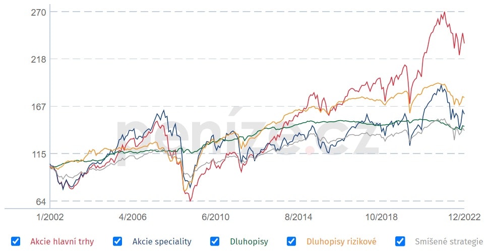 V loňském roce se na cenotvorbě mnoha finančních aktiv, především pak akcií a dluhopisů, podepsala vysoká inflace, která v ČR dosáhla 18 %, energetická krize, která zdražila provoz mnoha podniků a také rusko-ukrajinský konflikt, kterým celý loňský rok eskaloval. Na grafu níže si můžete prohlédnout cenový vývoj podílových fondů z jednotlivých tržních segmentů.