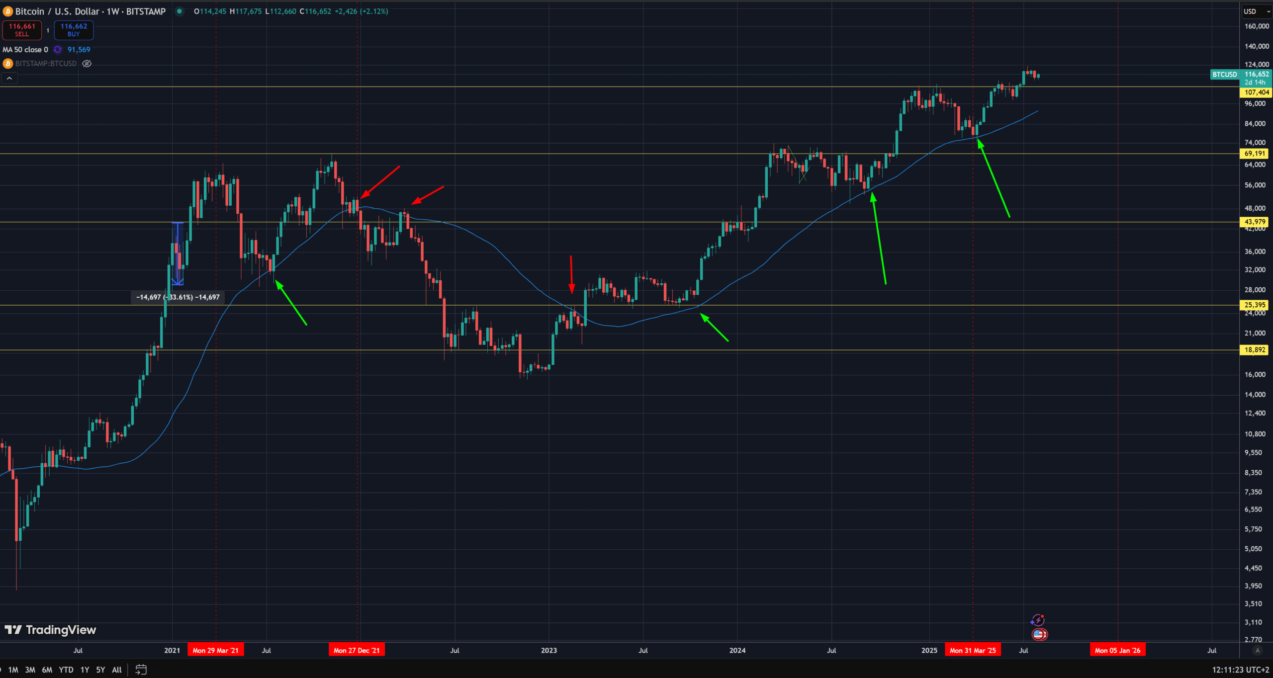 V kryptoměnách platí velmi jednoduchá poučka. Pokud jsme nad touto hranicí, tak jsme v období bullmarketu. Pokud jsme prokazatelně pod hranicí 50 WMA, tak se můžeme připravit na bullmarket.