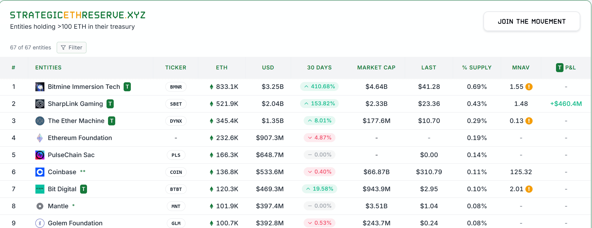 Na trhu je nyní devět společností, které mají Etherové rezervy přesahující 100 000 ETH. Tom Lee, který vede se svým Bitmine je prozatím na vrcholu této pyramidy.
