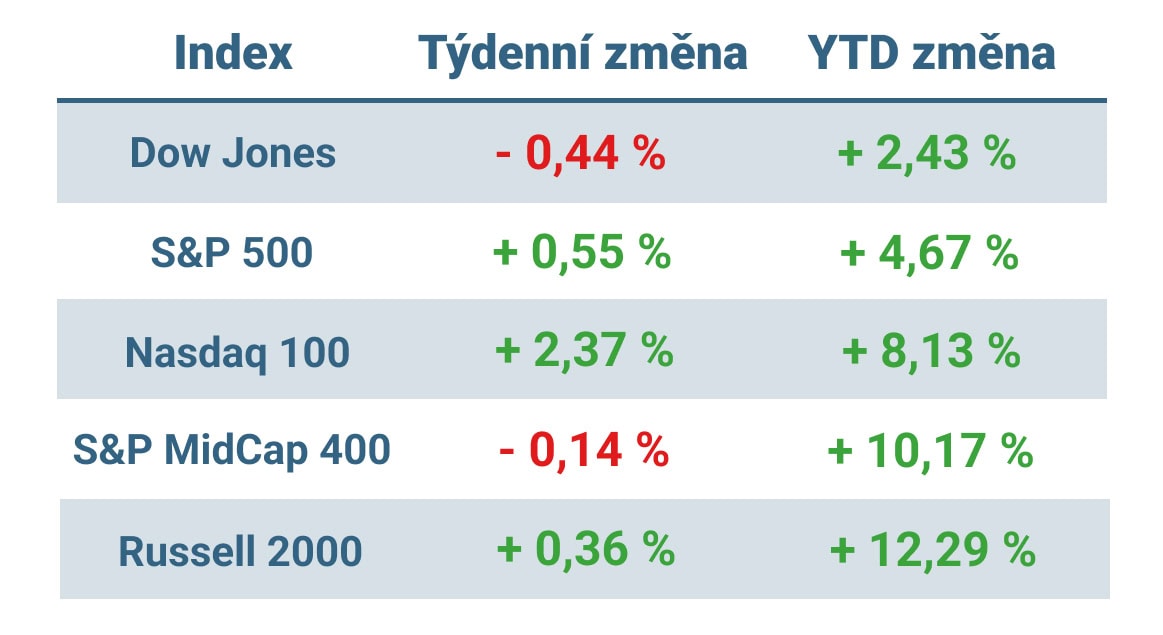 Tabulka ukazuje vývoj nejvýznamnějších amerických indexů v uplynulém týdnu a od začátku roku