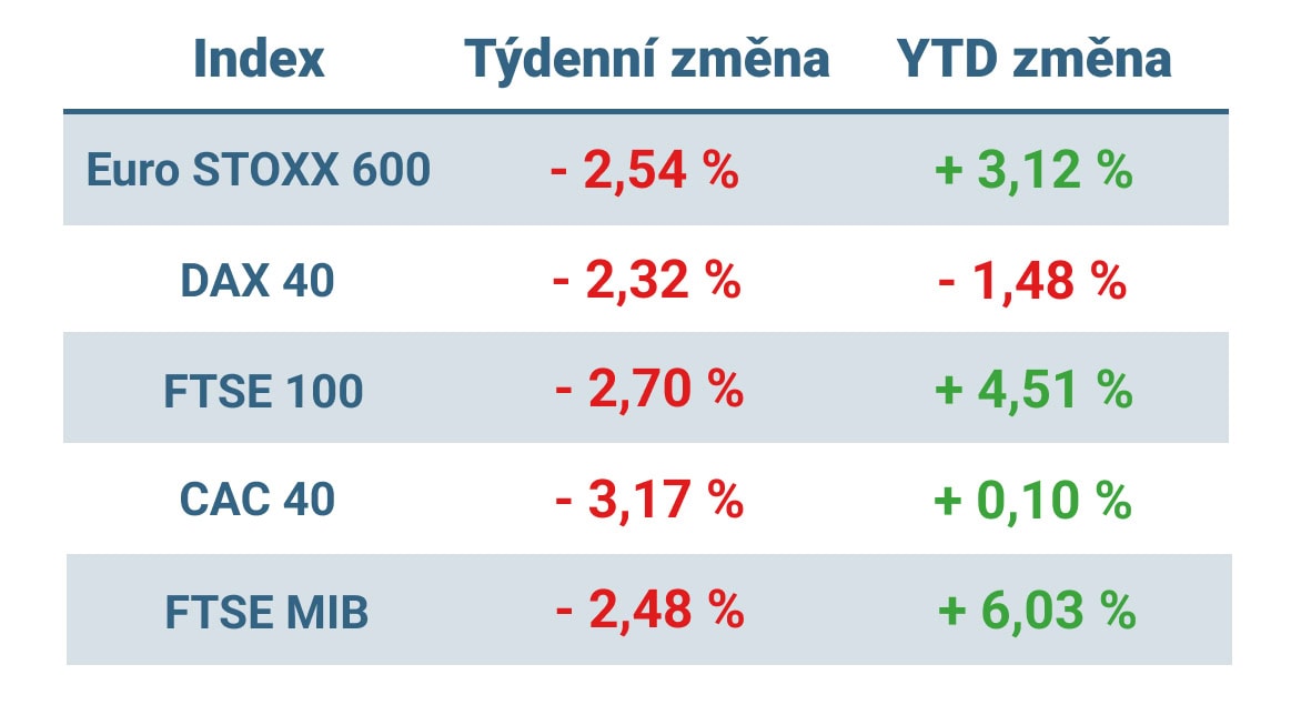 Tabulka ukazuje vývoj nejvýznamnějších evropských indexů v uplynulém týdnu a od začátku roku