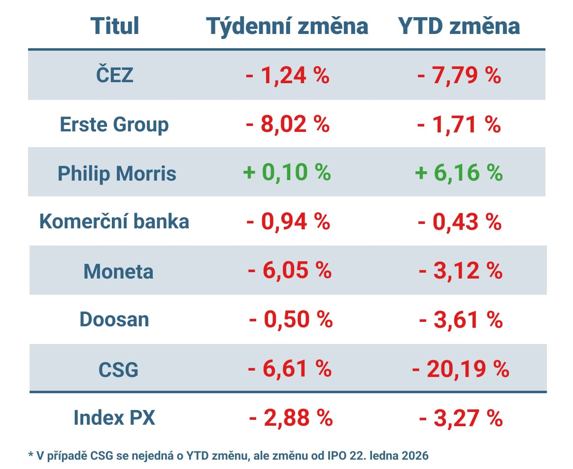 Pražská burza má za sebou nelehký týden. Široký index PX odepsal 2,88 % a od ledna už kumuluje ztrátu 3,27 %, čímž náš trh bohužel výrazně zaostává za americkými i některými evropskými benchmarky.