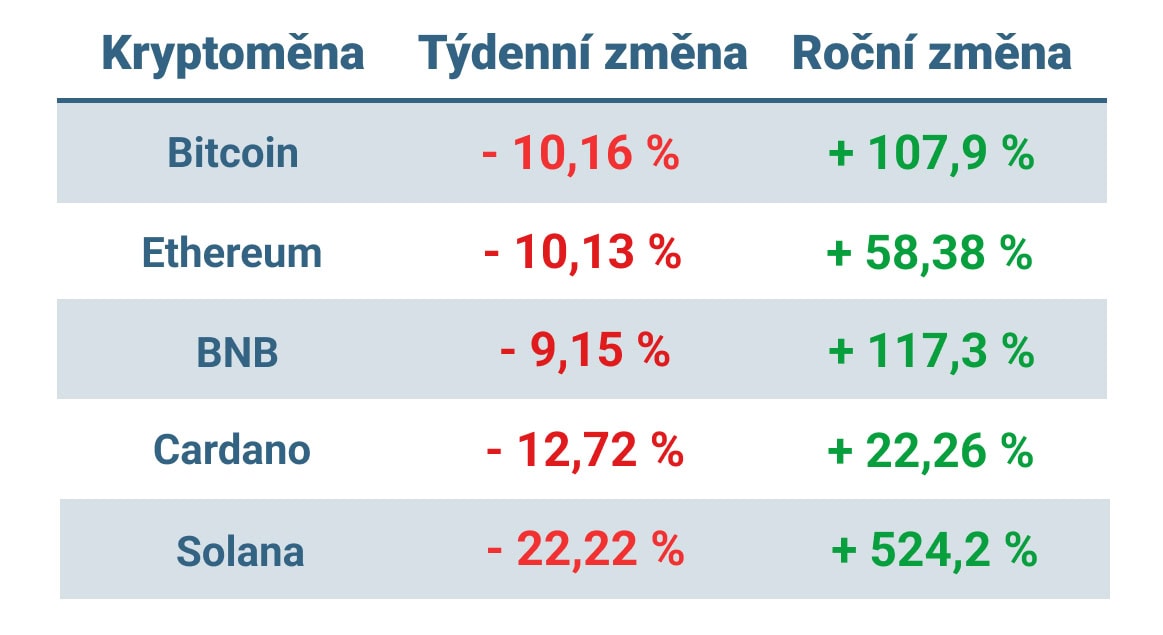 Těžký týden zažila také Solana, která se propadla o více než 22 % na 143 dolarů.
