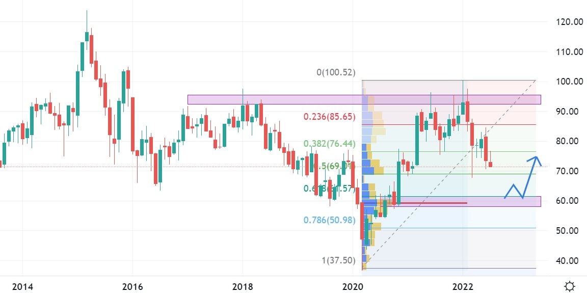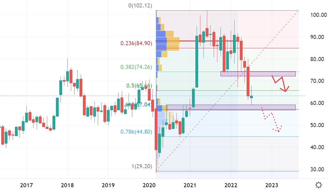 Ani akcie této společnosti moc optimismu do žil automobilových investorů nenalijí. Současná cena značí opět pokles o 40 %. Akcie Porsche vykazují nákupní aktivitu na nejsilnějším supportu na cenovém grafu, který je v konfluenci se silnou volume a také 61,8 % Fibonacciho retracementu. Pokles akcií pod hodnotu supportu může otevřít dveře pro pád až na 30 EUR, což je nejnižší cena akcií Porsche za sledované období.