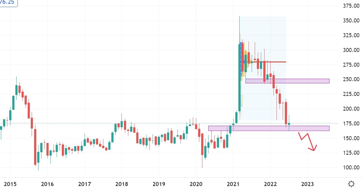 Další německý motoristický gigant je na tom, co se týče akciového vývoje, mnohem hůře. Od roku 2021, kdy byla vytvořena maxima, se akcie propadly o 50 % své hodnoty, přičemž se nyní obchodují na ceně 175 EUR. Akcie Volkswagen dosáhly hodnoty nejsilnějšího supportu na cenovém grafu, takže jeho překonání může poslat jejich hodnotu na velmi nízké ceny, okolo 100 EUR. Vzhledem k mnoha negativním signálům z technické analýzy, nevydávají analytici z Wall Street žádné prognózy pro tyto akcie.