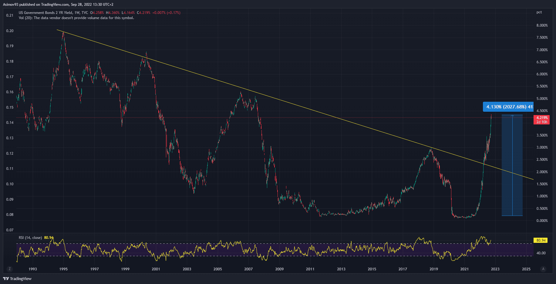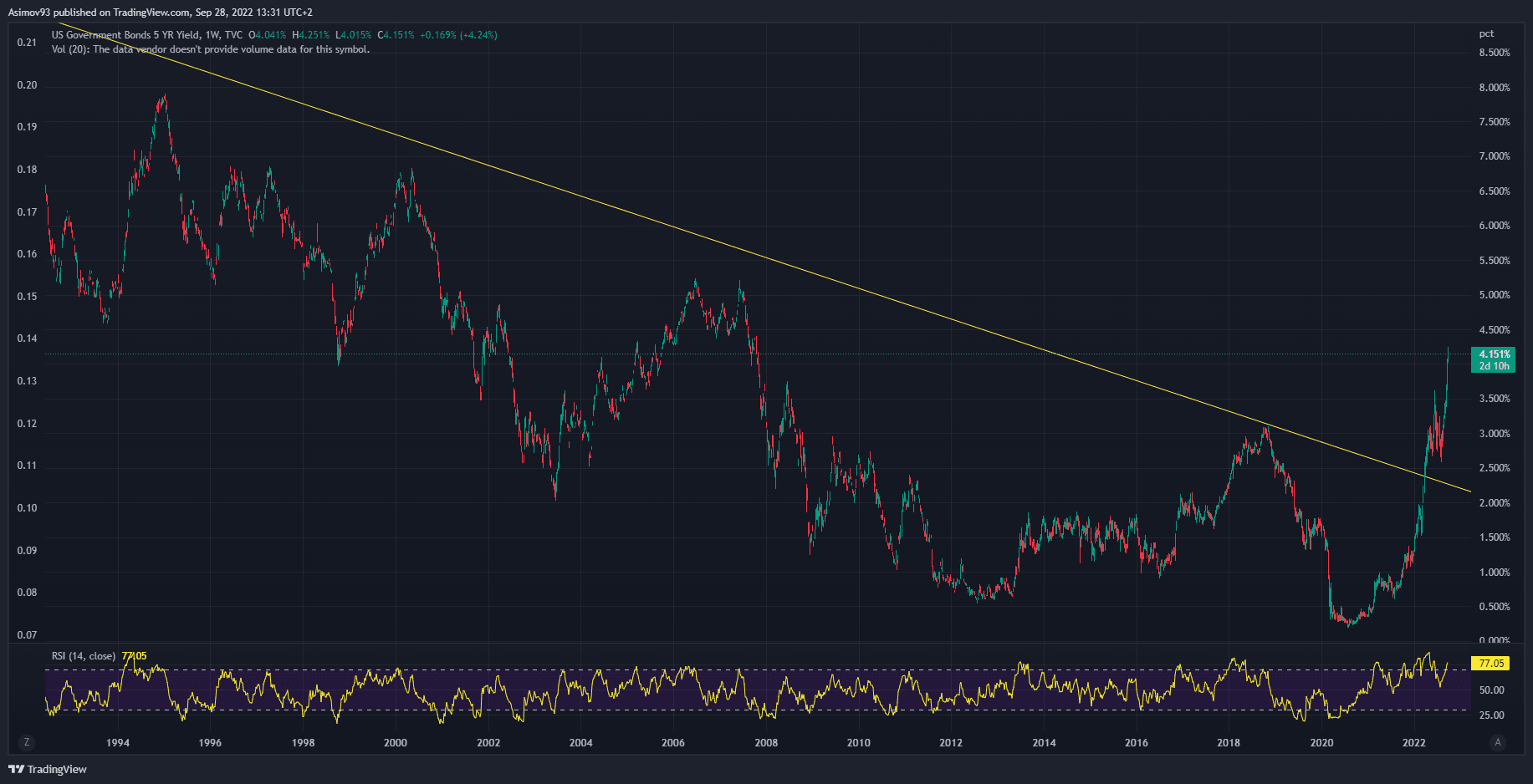 Na pětiletých splatnostech je situace velmi podobná. Růst tu byl zhruba poloviční jako u dvouletých splatností. Ale i zde jsme se dostali na úrovně, které trhy naposledy pamatují z roku 2007. Co to v širším měřítku znamená? Je to obrovský tlak na reálnou ekonomiku a samozřejmě i akciový trh, protože se měnové prostředí radikálně utahuje.