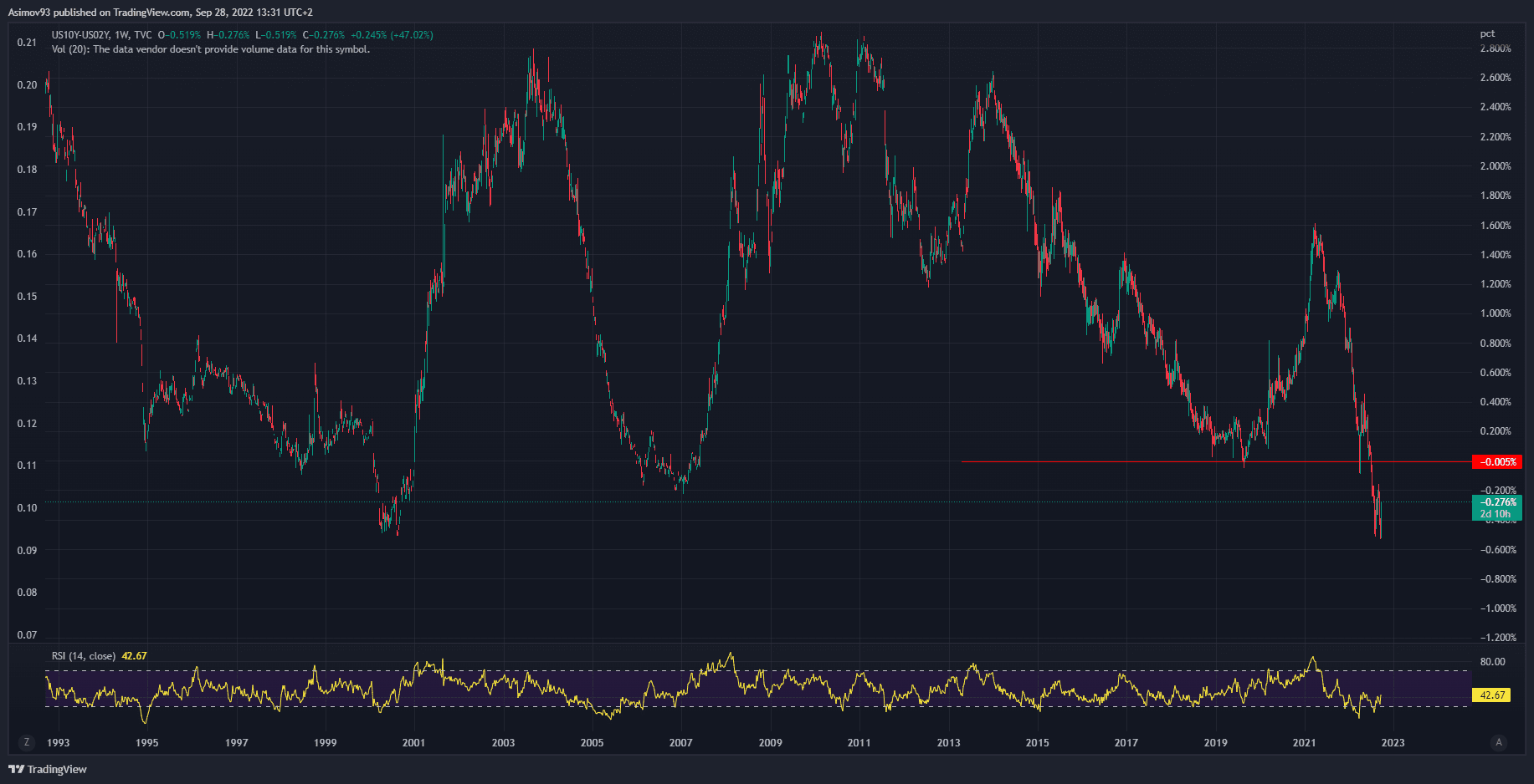 Když se podíváme ještě na dlouhodobější graf spreadu, zjistíme, že blízké dno se vytvořilo na úrovních, kde byl trh posledně v 80. letech. Docela solidní sonda do minulosti. Mimochodem, spread je nyní -0,24 %. A jsem hodně zvědavý, zda jde o finální dno, nebo se situace ještě přiostří.