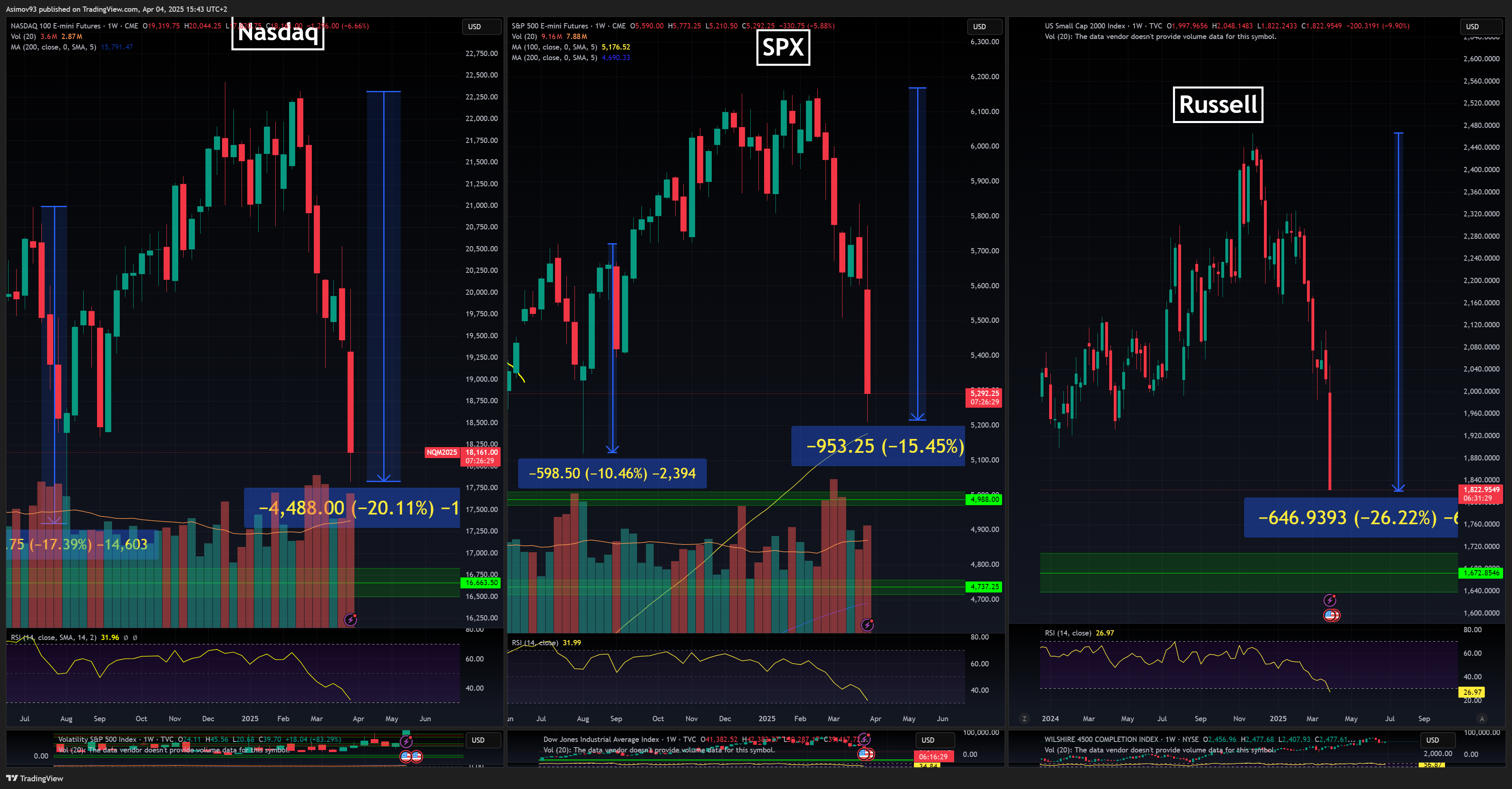 Hlavní americké akciové indexy dál prohlubují kurzové ztráty a vytváří nová lokální minima. Nasdaq po low už ztrácí 20 %, S&P 500 odepsal okolo 15 % a Russell 2000 dokonce spadl o více jak 25 %.