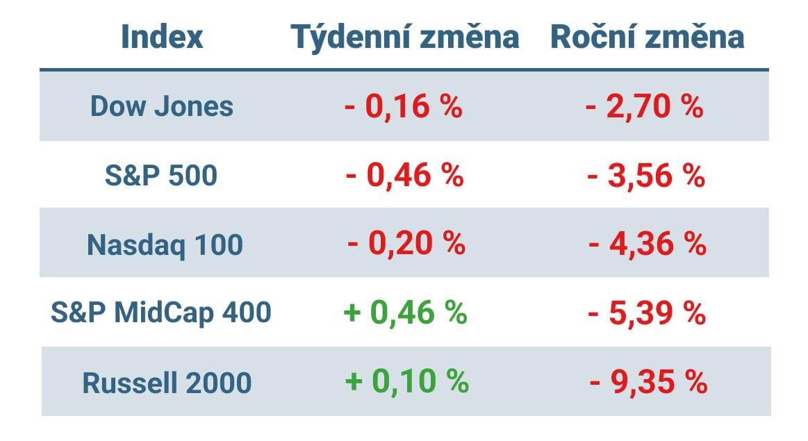 Tabulka ukazuje vývoj nejvýznamnějších amerických indexů v tomto týdnu a v roce 2025
