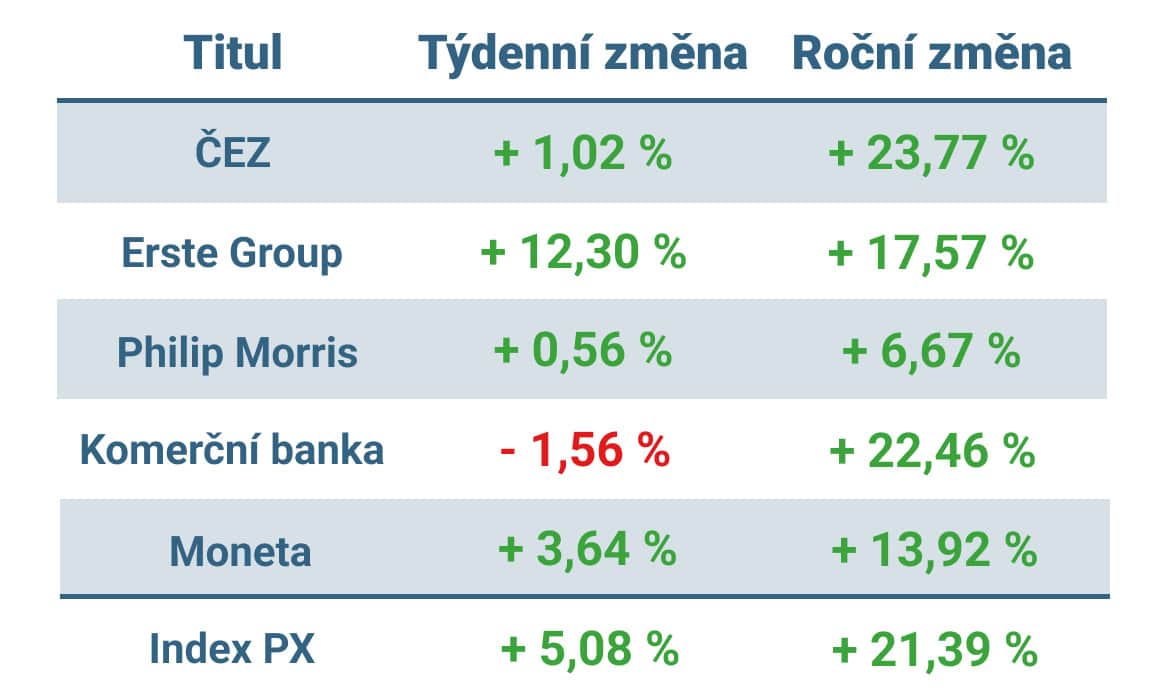 Pražská burza si na rozdíl od většiny globálních trhů připsala v týdnu výrazný zisk. Index PX zakončil páteční obchodování na úrovni 2 146 bodů, což představujetýdenní zisk přes 5 %.