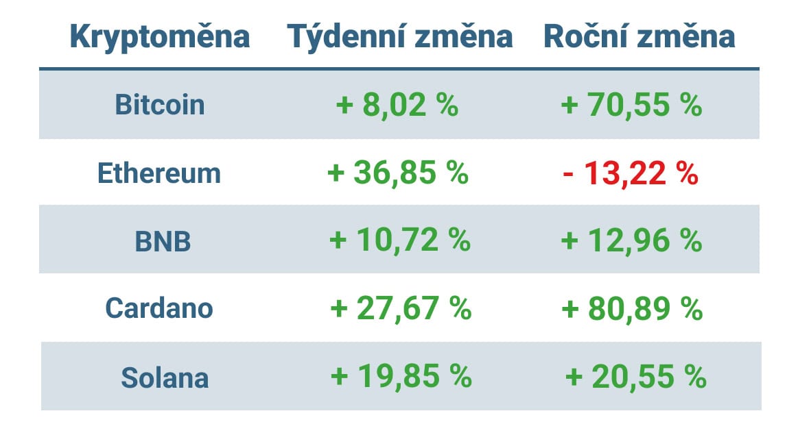 A dařilo se i dalším altcoinům. Cardano si v týdnu připsalo přes 27 %, Solana vyletěla o necelých 20 % a cena BNB vzrostla o téměř 11 %.