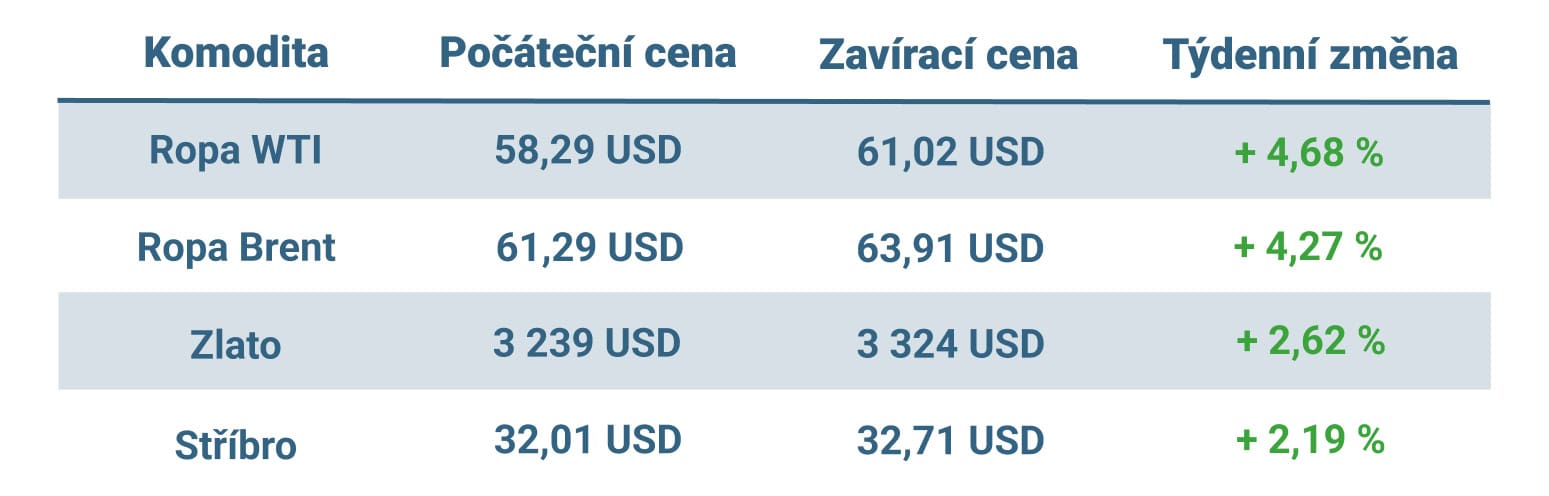 Pozitivní vývoj jsme pak sledovali i na trhu s drahými kovy. Cena zlata měla v uplynulém týdnu stoupající tendenci a ke konci pátečního obchodování se usadila na hodnotě 3 324 dolarů za unci, což znamená týdenní zisk přes 2,5 %.