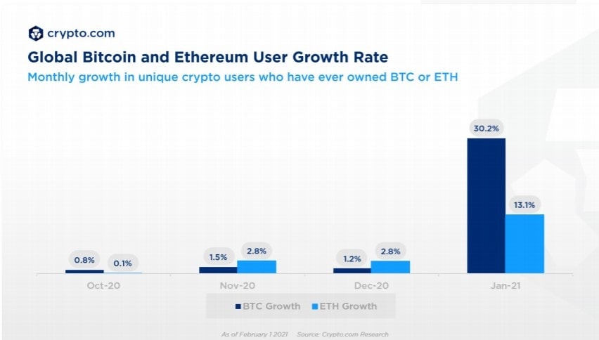 Bitcoin i Ethereum zaznamenaly největší růst počtu uživatelů v lednu letošního roku. Zdroj: Crypto.com