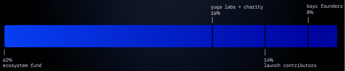 Výše můžete vidět alokaci tokenů, přičemž právě kvůli rozdělení počtu tokenů se v kryptoměnové komunitě rozpoutala debata. Až 38 % všech tokenů se rozdělí mezi zakladatele, Yuga Labs a osoby, které přiložily ruku k dílu při uvedení na trh.