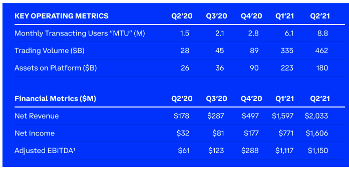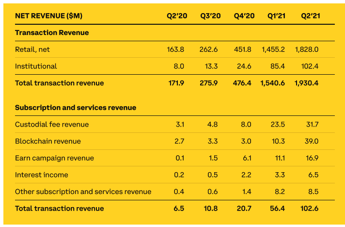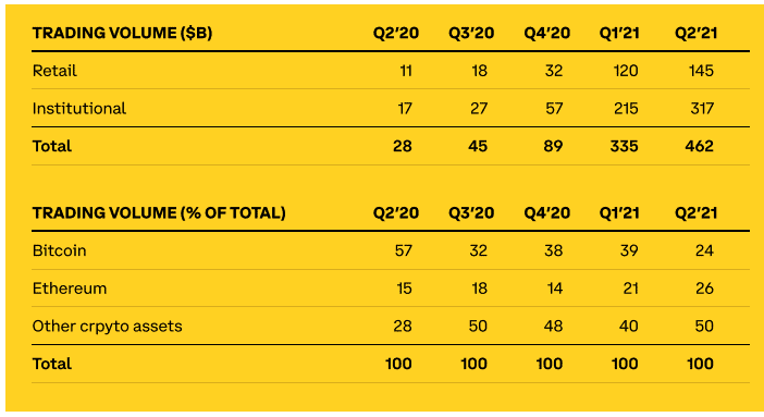 Institucionální objem obchodování činil 317 miliard USD, což je nárůst o 47 % ve srovnání s 1. čtvrtletím. Institucionální objem zahrnoval 69 % z celkového objemu obchodování, což je nárůst ze 64 % v 1. čtvrtletí. Ve 2. čtvrtletí se rychle zvýšil institucionální vstup na platformu Coinbase a také byla zaznamenána vyšší alokace kapitálu do kryptoměn.”
