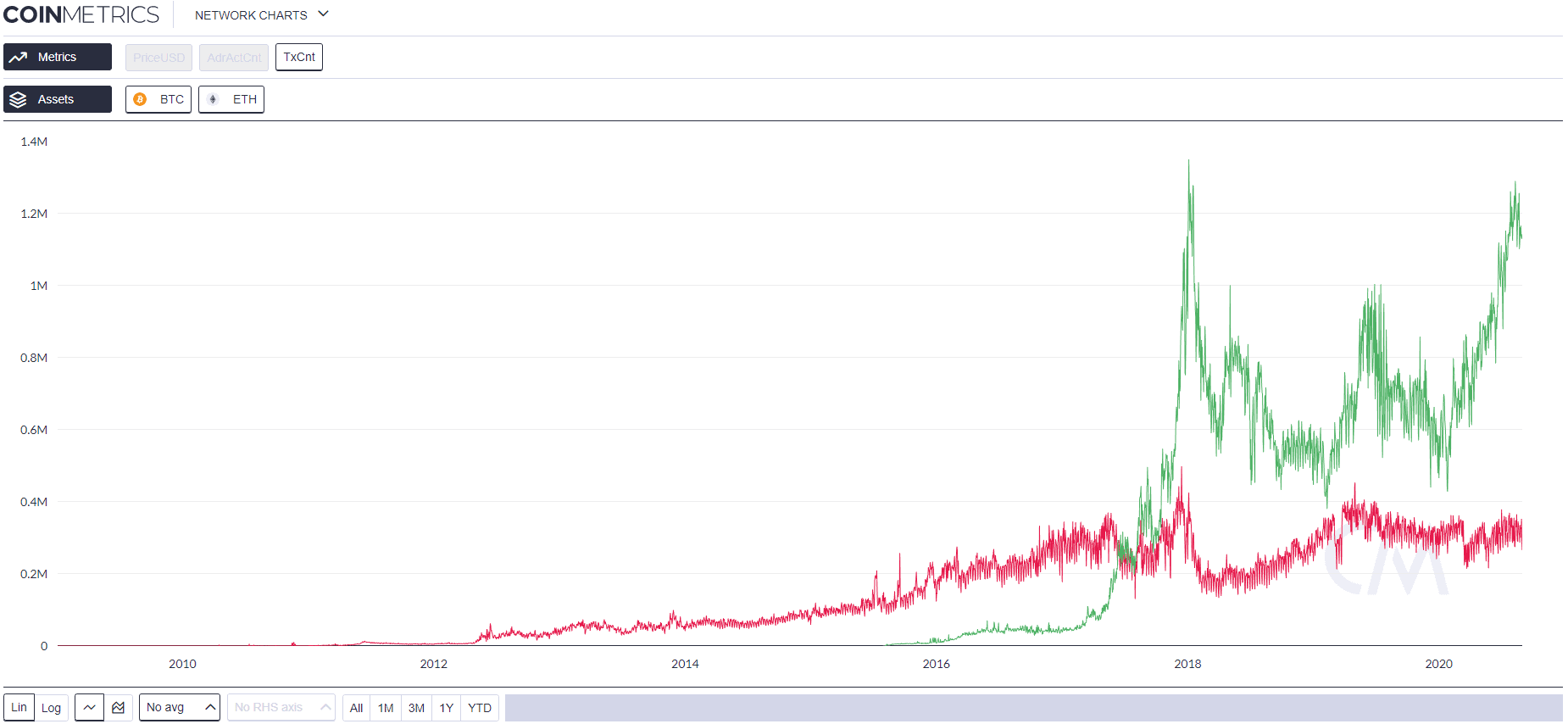 Zatímco Bitcoin je největší kryptoměnou co se tržní kapitalizace týče, tak podle využití sítě je králem kryptoměn Ethereum. To dlouhodobě vykazuje nejvíc transakcí v kryptoprostoru.