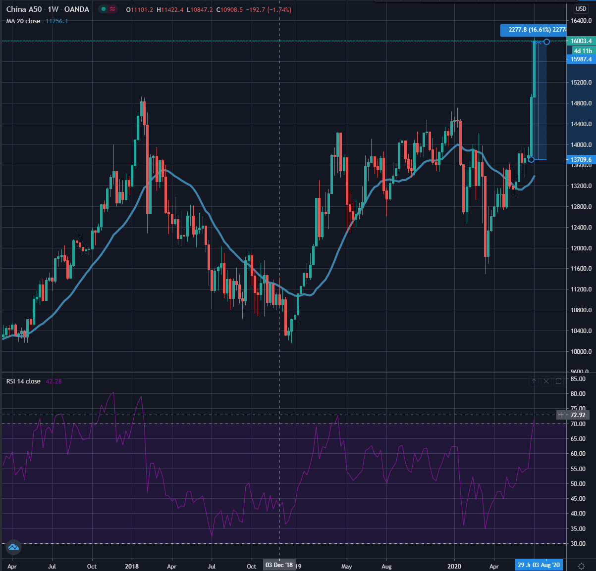 Akciový index A50 pro největší čínské obchodované akcie zaznamenal v posledních dvou týdnech překotný růst. Za poslední dva týdny se právě čínský akciový trh vzedmul k nevídanému růstu. V průběhu posledních 14 dnů dosáhl index A50 na nové ATH a připsal si přibližně 17 %.