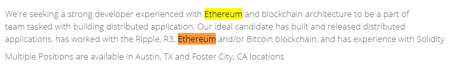 V inzerátu společnosti Visa je primárně zmíněno Ethereum a schopnost programovat v jazyce Solidity, což je programovací jazyk ETH smart kontraktů.