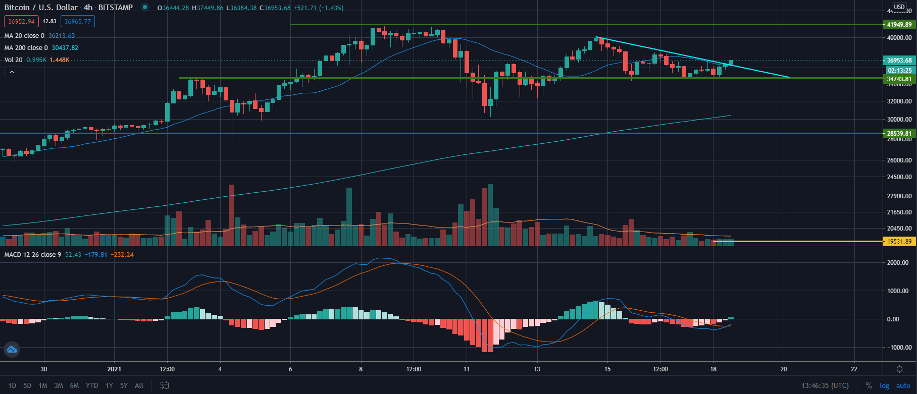 Jak je vidět na 4H grafu výše, tak cena se ustálila v pásmu mezi $ 35 000 a $ 41 000. Cena BTC se v posledních dnech nacházela ve formaci klesajícího trojúhelníku. Ačkoliv se jedná spíše o bearish formaci, tak se prozatím zdá, že z krátkodobého hlediska můžeme vidět mírný vzestup.