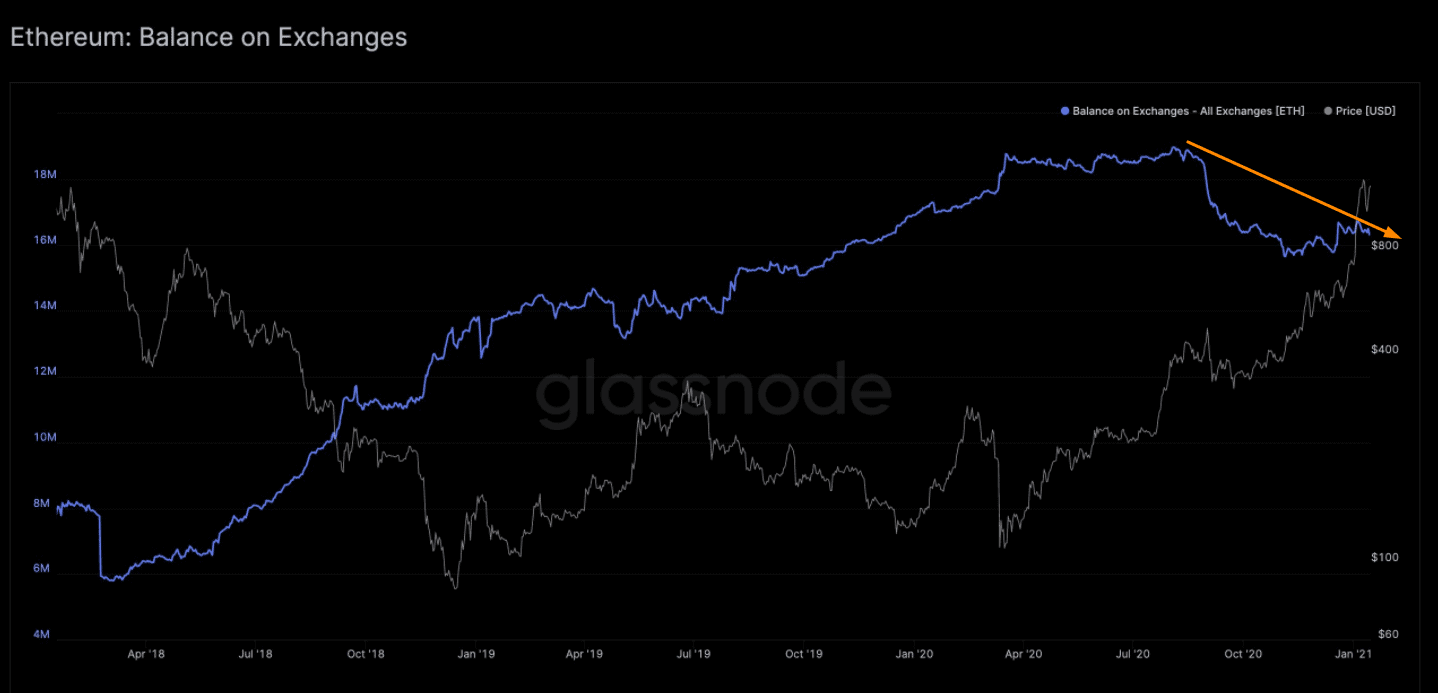 Počet ETH na burzách klesá