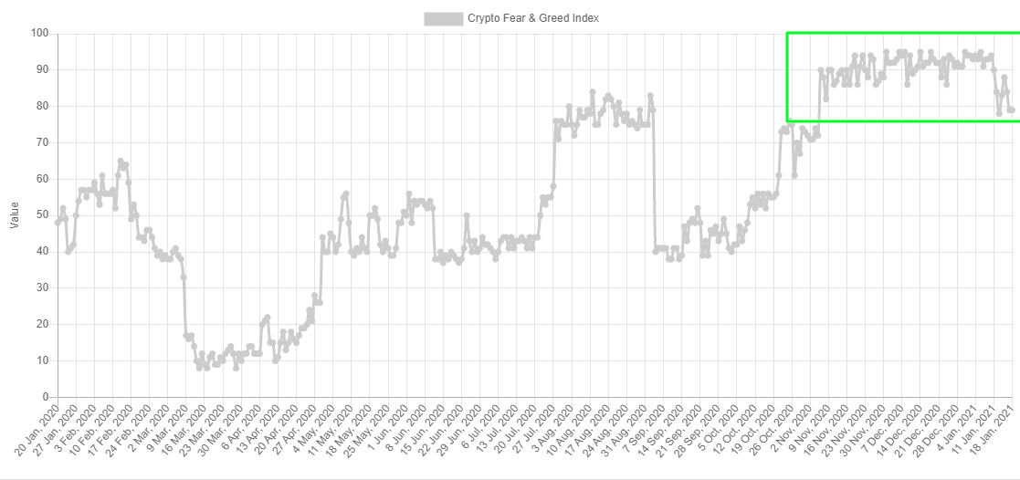 Jak je vidět výše na grafu tzv. Fear and Greed indexu, již tři měsíce jsme v extrémních číslech, ačkoliv v posledních dnech můžeme vidět mírný pokles v chamtivosti investorů. Stále se ovšem nacházíme v oblasti extrémní chamtivosti.