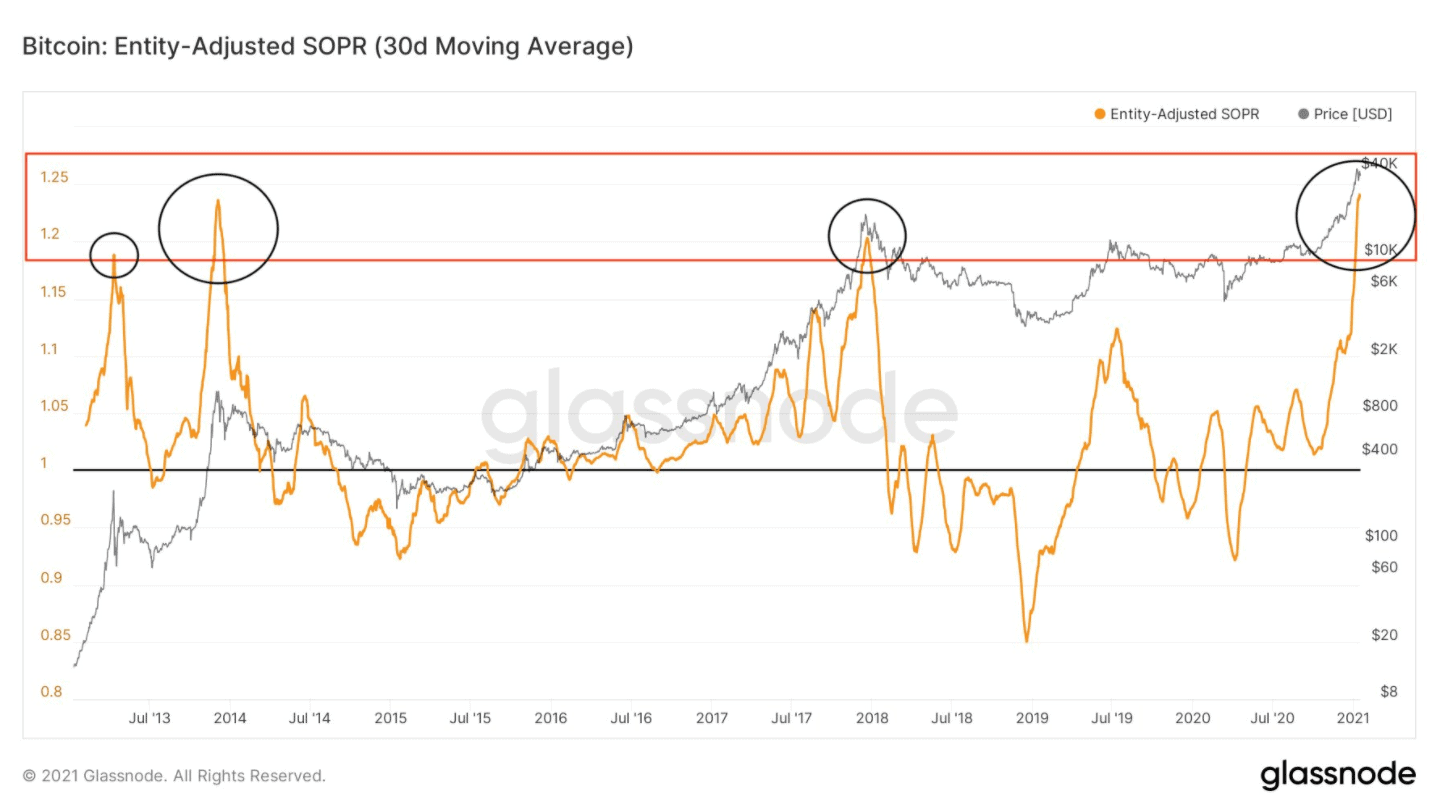 Fakt, že se SOPR nyní nachází v extrémně exponované fázi značí, že riziko výraznější korekce je opravdu znatelné.