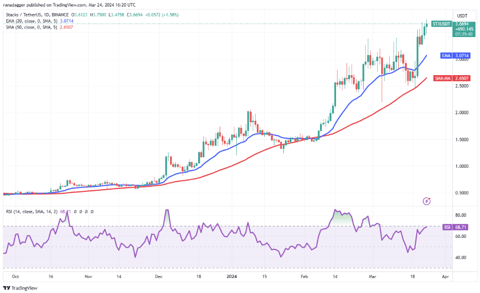 Mince Stacks (STX) je nyní nad rezistencí 3,4 USD. Oba klouzavé průměry míří pěkně nahoru a RSI se pohybuje v horní části pásma těsně pod hranicí překoupenosti. To naznačuje nadvládu kupujících a vzestupný trend s potenciálním růstem na 4,3 USD.