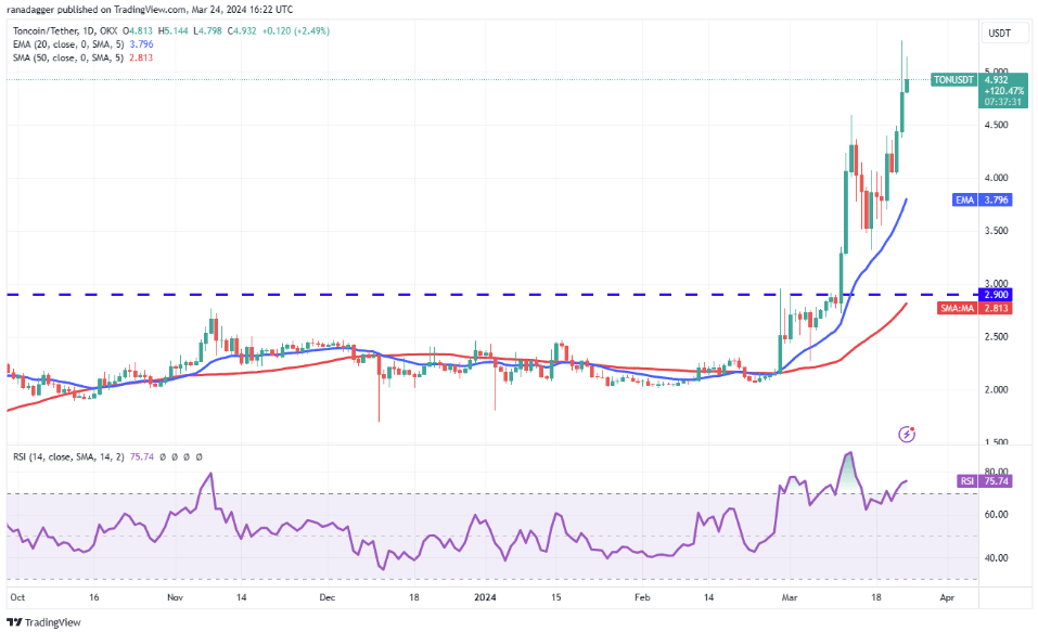 Toncoin (TON) se 23. března vyšplhal nad rezistenci 4,60 USD, což naznačuje začátek další etapy rostoucího trendu.