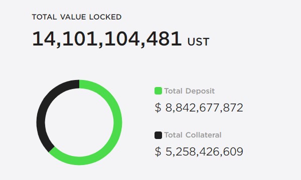 V protokolu Anchor je celkem zamknuto 14 miliard USD. Pro srovnání v ethereovém protokolu Compound je umístěno 15 miliard USD a v AAVE 18 miliard USD.
