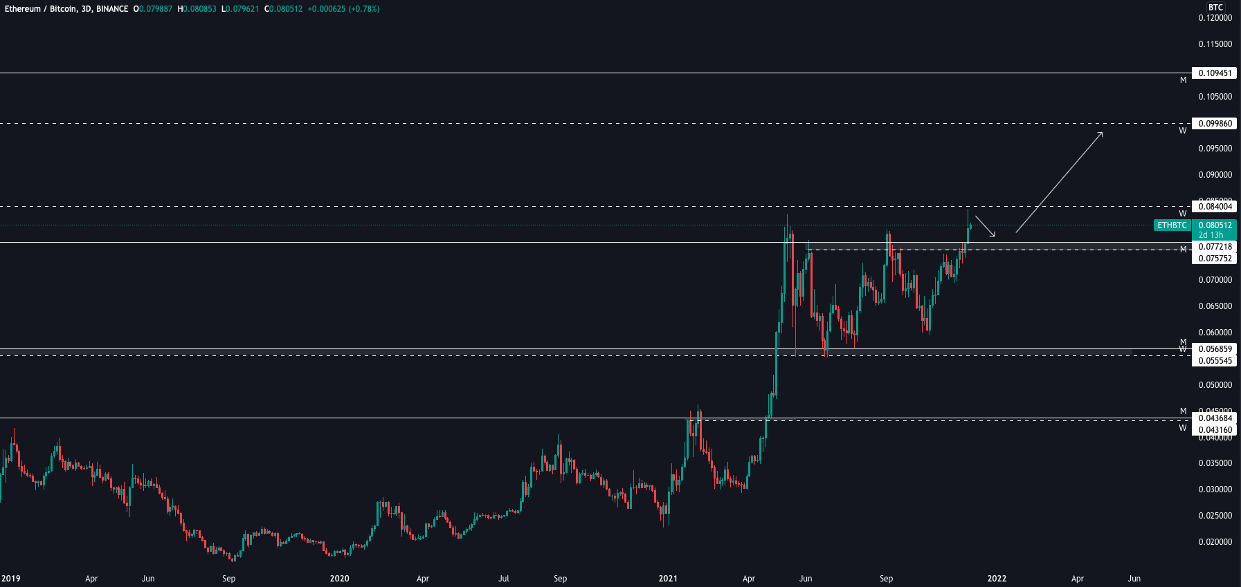 V minulém příspěvku jsme se také bavili o tom, že ETH/BTC je připravené prorazit rezistenci a začít svůj bullish trend. Toto se v posledním týdnu také odehrálo a pokud uzavře i týdenní svíce tak, jak je ETH nyní nastavené, dlouhodobý trend posilování Etherea vůči Bitcoinu, by mělo pokračovat. hlavní dlouhodobá rezistence poté bude na 0,1 BTC.