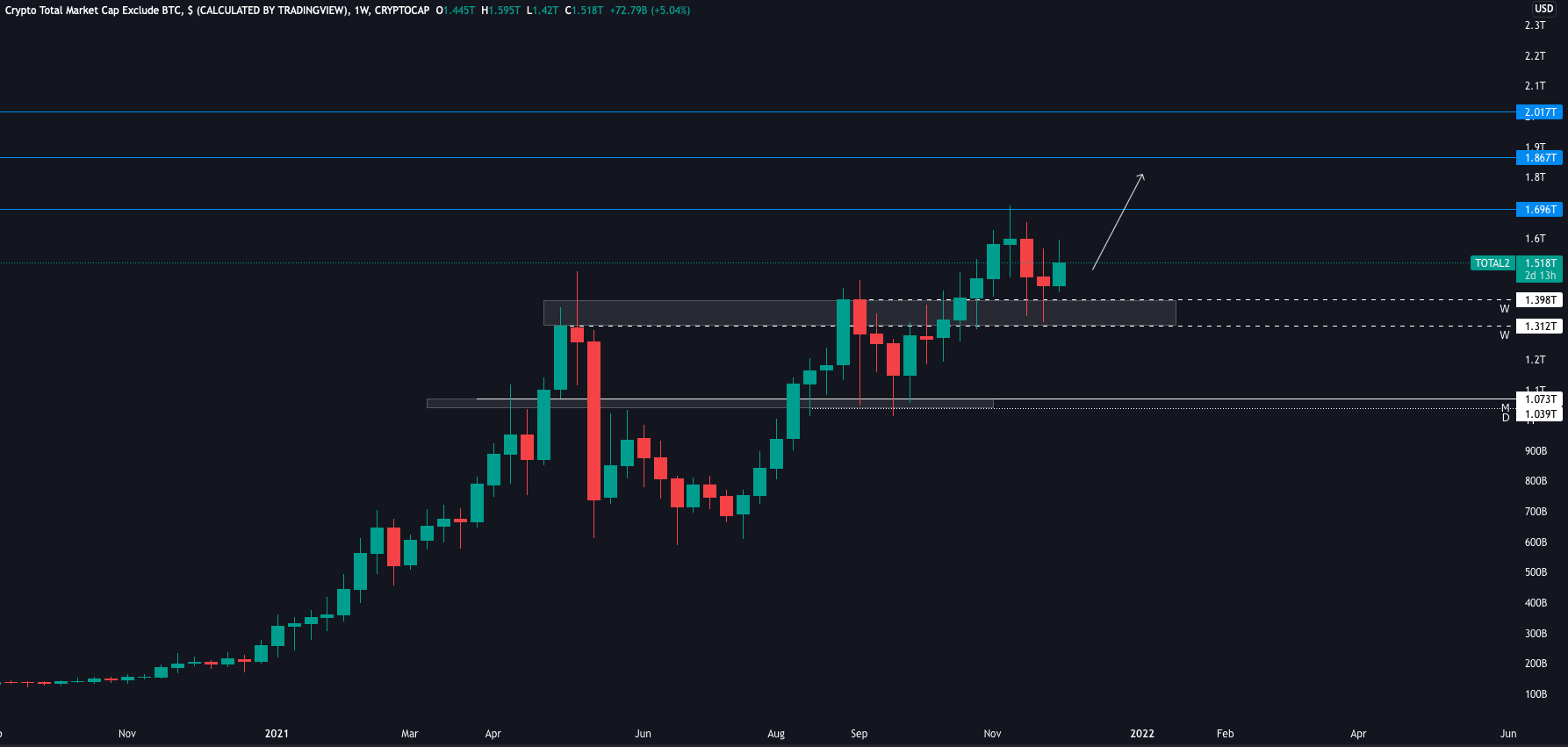 Možná právě protože Ethereum vyrazilo takto agresivně nahoru, se ukazuje i tržní kapitalizace všech altcoinů jako velmi bullish. Níže vidíme týdenní graf, který pěkně reaguje na vyznačené supporty a rezistence. Trend je tedy stále platný a můžeme očekávat v dalších týdnech posun až z 1,85 a případně 2 bilionům dolarů.